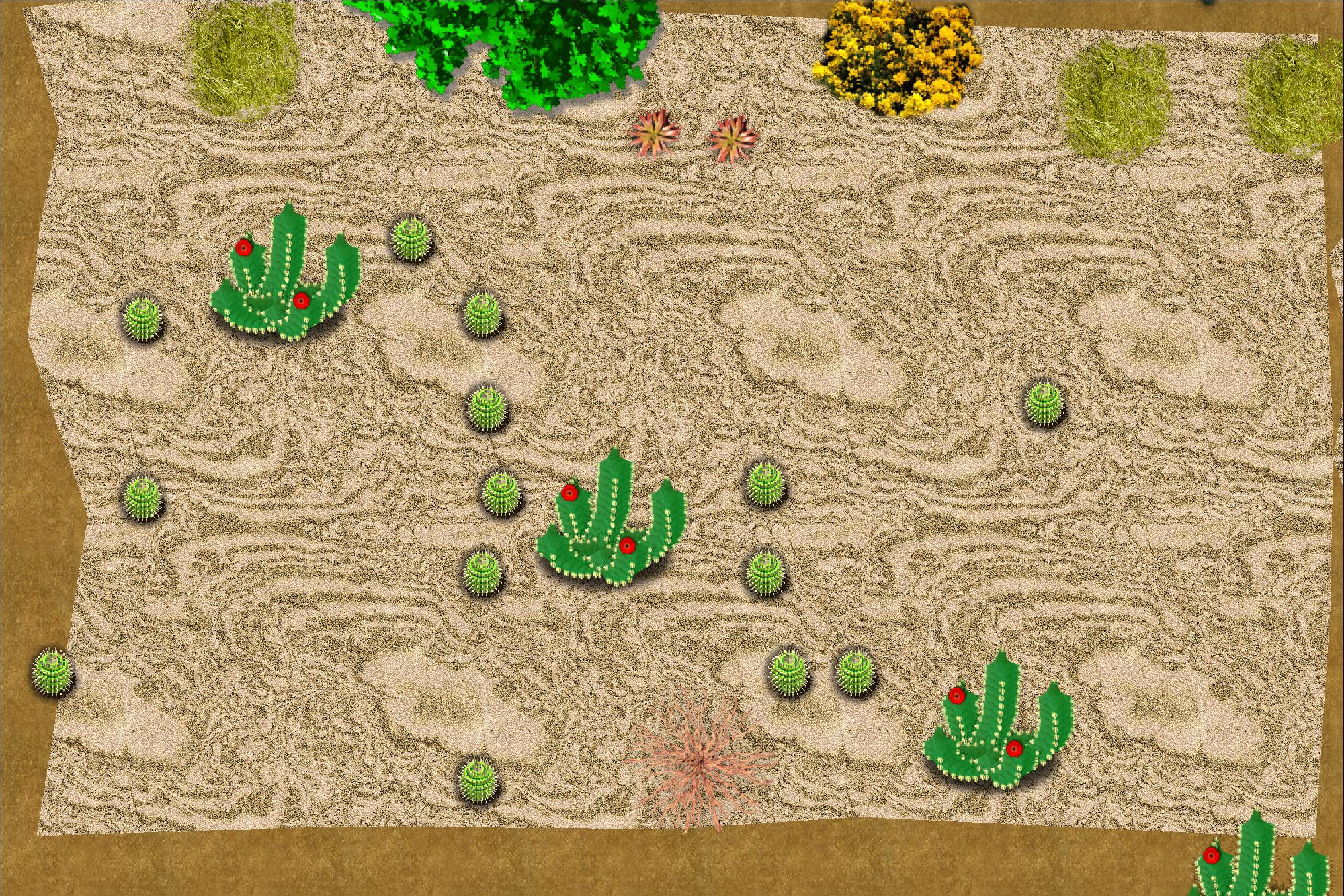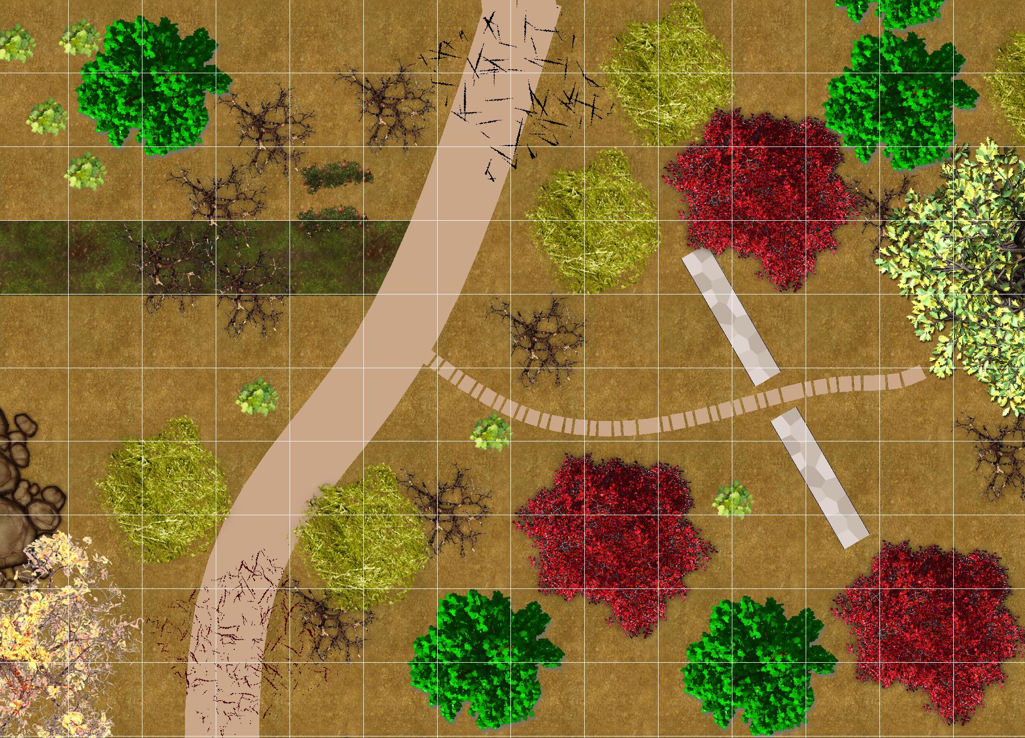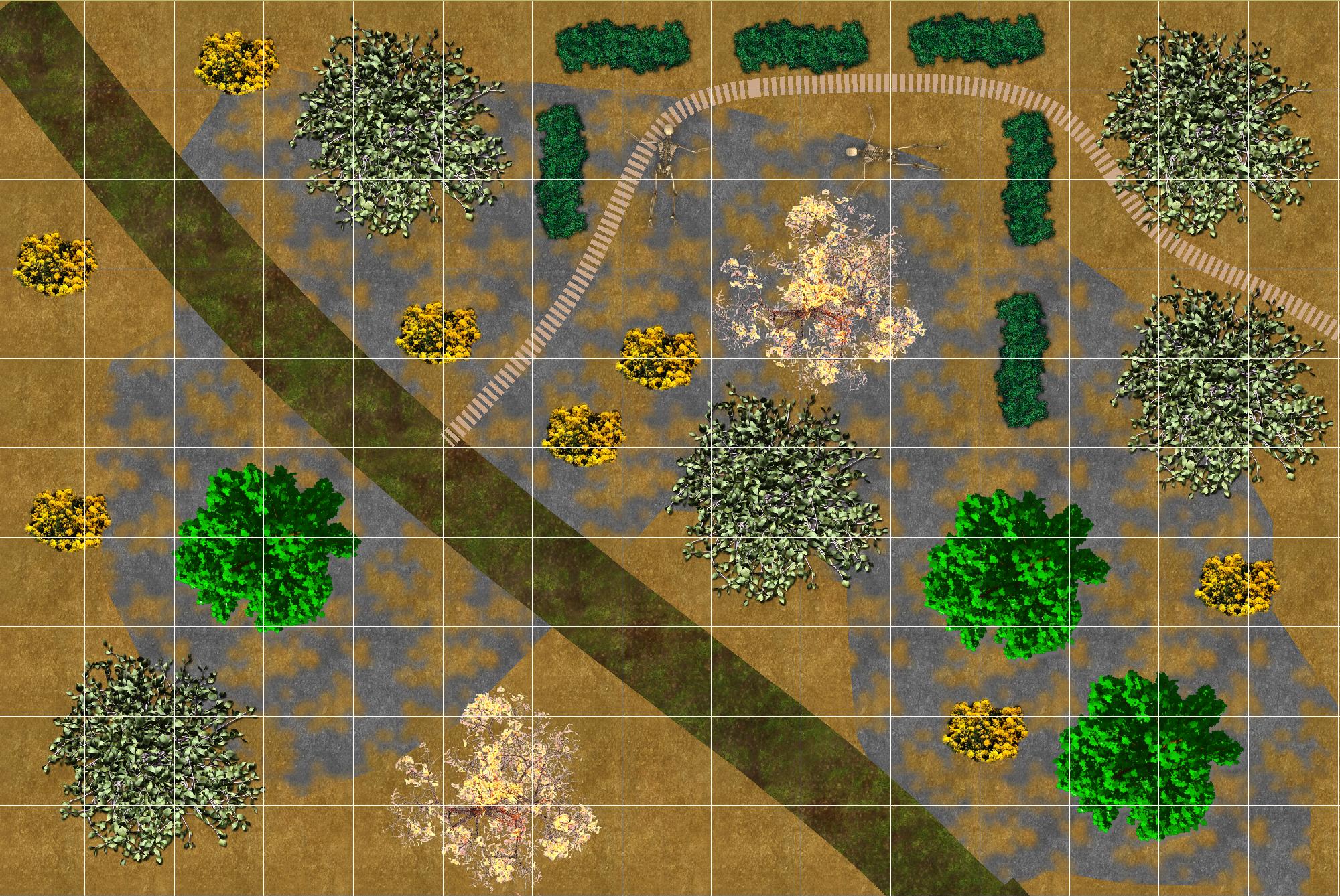 8. leafless brush, green brush, orange/yellow brush, wide path, 2 narrow paths, 3 skeletons, broken wall, pergole
