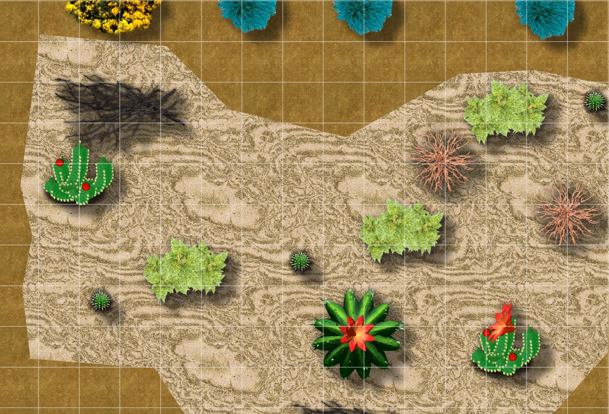 7. small sand area, a few bushes, a narrow path, a few small leafless bushes.