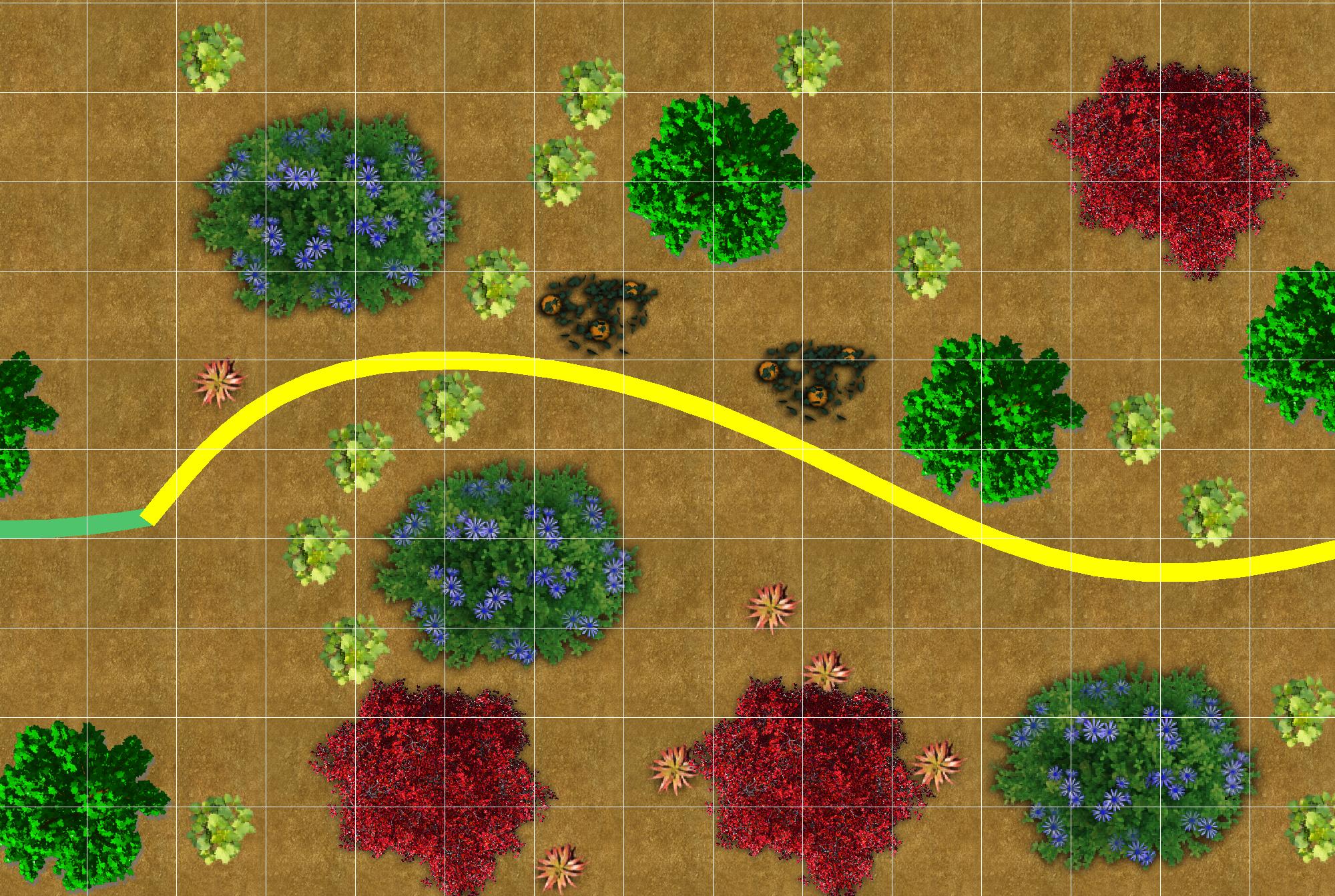 10. a number of rock piles, a gravel path, 2 bushes, a wide green path, a wide brown path